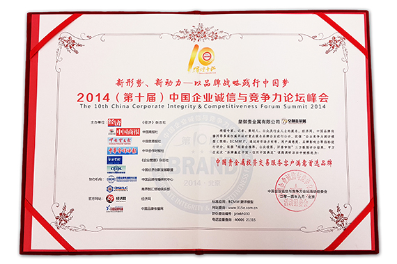 2014年9月27日,皇御贵金属应邀出席“新形势、新动力——以品牌战略践行中国梦”2014(第十届)中国企业诚信与竞争力论坛峰会。本大会由《经济》杂志社、中国商报社、中国贸易报社、中华合作时报社、《企业管理》杂志社、中国经济创新发展联盟联合主办,由中国品牌传播研究中心、商界智汇领袖俱乐部协办。